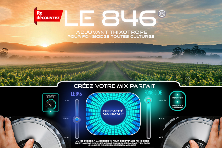 C’est pour répondre à ces deux enjeux majeurs que nous avons retravaillé la dose de LE 846®, en proposant une préconisation additionnelle à 0,5 %. Vous avez ainsi toutes les cartes en mains pour créer votre mix parfait : sécuriser vos traitements, gagner en souplesse à coût maitrisé. C’est plus de sérénité, plus de protection et plus de valeur pour vos vignes.