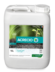 ACRECIO stimule le développement racinaire, pour des racines larges et profondes, optimisant les capacités naturelles des plantes à assimiler les nutriments et l’eau. L’efficacité d’ACRECIO est démontrée sur de nombreuses cultures à travers le monde. ACRECIO c’est une combinaison technologique unique – Acides humiques & fulviques, 2 acides aminés sélectionnés & libres, et les éléments fertilisants majeurs. Fruit de plusieurs années de recherche, ACRECIO fournit l’énergie indispensable au démarrage des plantes, boostant les implantations !