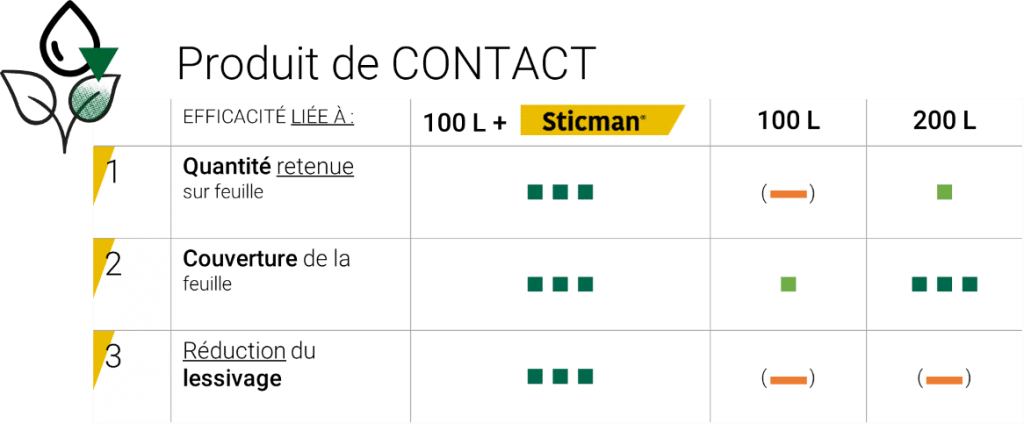 De nombreux fongicides (soufre, cuivre, folpel,…) ont également ce mode d’action. Même associés à des fongicides pénétrants ou systémiques (triazoles, SDHI,…), la stratégie d’adjuvantation vise toujours le mode d’action le plus exigeant à savoir les produits de contact.Pour être pleinement efficaces, ces produits de protection de contact ont 3 niveaux d’exigence :