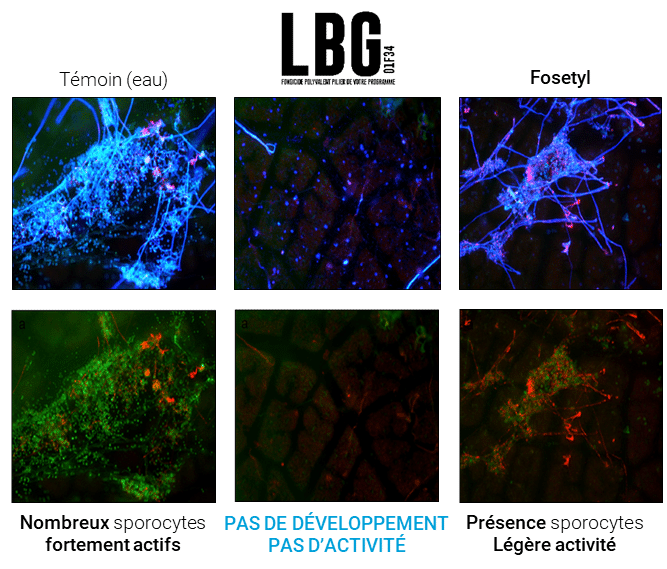 La visualisation des spores de mildiou est opérée par microscopie à épifluorescence, après inoculation et traitement sur des plantules de vigne en pot. LBG-01F34 pénètre rapidement par les feuilles pour être redistribué dans toute la plante et être ainsi à l’abri du lessivage, dès 2 h après le traitement.