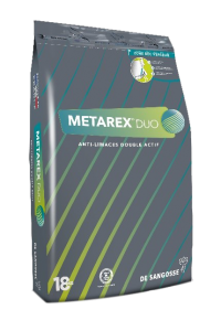 METAREX® DUO – AMM n° 2190173. Phosphate ferrique IPmax 16.2 g/kg, Métaldéhyde 10 g/kg.- Marques déposées, autorisation de mise sur le marché et fabrication : DE SANGOSSE – P102 Tenir hors de portée des enfants P270 Ne pas manger, boire ou fumer en manipulant ce produit P273 Eviter le rejet dans l’environnement P391 : Recueillir le produit répandu P501 Eliminer le contenu/le récipient conformément à la règlementation locale/nationale SP1 Ne pas polluer l’eau avec le produit ou son emballage SPe3 Pour protéger les organismes aquatiques, respecter une zone non traitée de 5 mètres en bordure des points d’eau pour tous les usages. SPe6 : Pour protéger les oiseaux/les mammifères sauvages, récupérer tout produit accidentellement répandu.