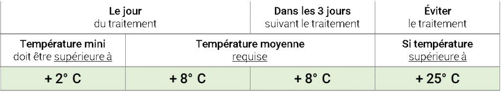 ORFEVRE® est peu dépendant des conditions climatiques. Il peut être appliqué dès que la température extérieure dépasse 2°C, et jusqu’à une température maximum de 25°C. Idéalement, l’application sera à programmer lorsque des conditions poussantes, avec une bonne luminosité, sont annoncées dans les 3-4 jours suivants le traitement.