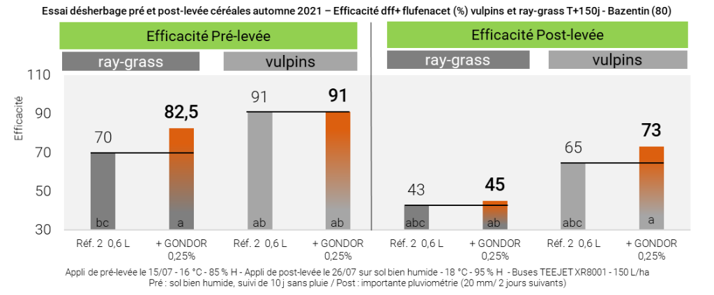 L’utilisation d’adjuvants améliore l’efficacité des programmes herbicides de 5 à 15 %, en pré-levée ou en post-levée précoce, particulièrement en conditions limitantes et sans incidence sur le manque de sélectivité.
