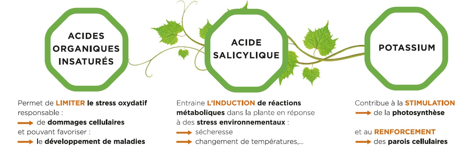 TEMPLARIO® PLUS permet de lutter contre les stress oxydatifs responsables de dommages cellulaires et pouvant favoriser le développement de maladies. Le potassium contribue au renforcement des parois cellulaires et à la stimulation de la photosynthèse. Ainsi, grâce à son action, TEMPLARIO® PLUS contribue à préserver la vitalité de la vigne.