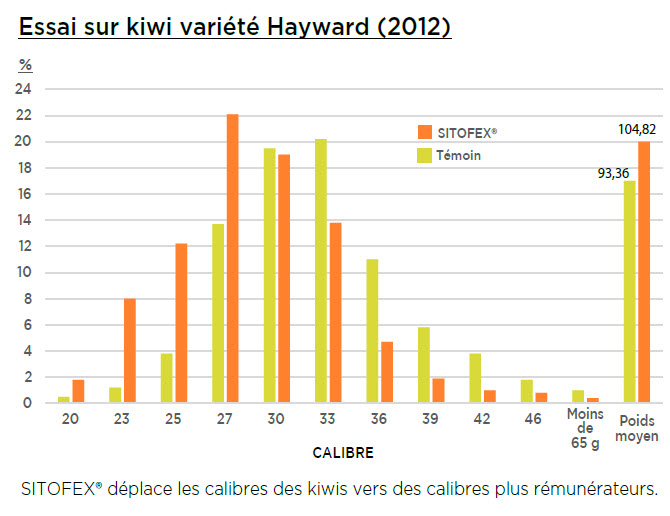 Grâce à son action, SITOFEX® 7.5 EC favorise une augmentation du calibre des kiwis et des baies de raisin et préserve la qualité de la récolte et sa tenue au stockage.