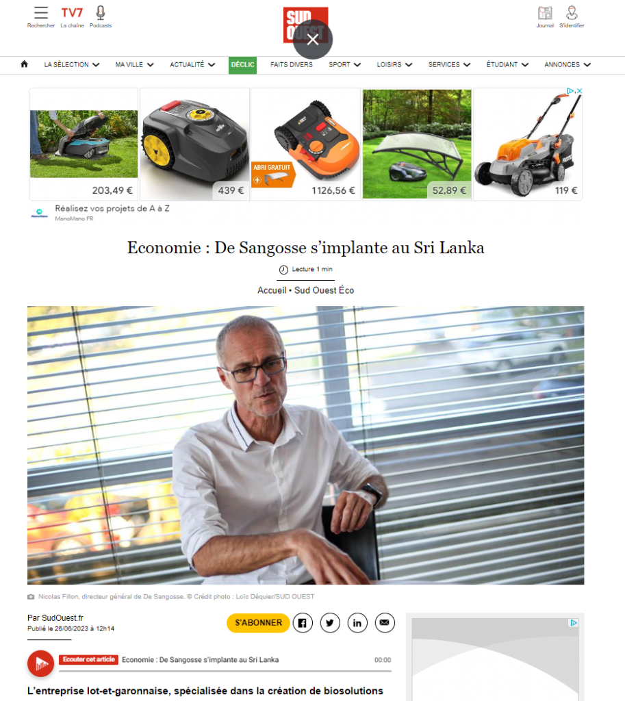 “…L’entreprise lot-et-garonnaise, spécialisée dans la création de biosolutions agricoles, crée une filiale en Asie du Sud-Est et poursuit sa stratégie de développement à l’échelle mondiale...” “…« L’expansion de De Sangosse au Sri Lanka démontre clairement notre engagement envers le groupe à développer notre offre de solutions biologiques dans toutes les parties du monde », déclare Stuart Miller, directeur général de la filiale…”