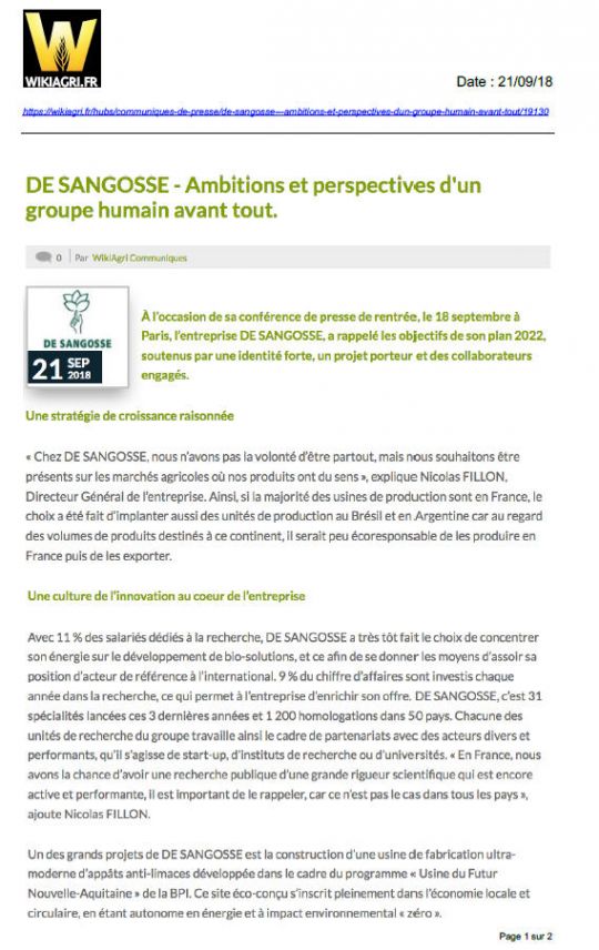 “Avec 11% des salariés dédiés à la recherche, DE SANGOSSE a très tôt fait le choix de concentrer son énergie sur le développement de bio-solutions, et ce afin de se donner les moyens d’asseoir sa position d’acteur de référence à l’international. 9% du chiffre d’affaires sont investis chaque année dans la recherche, ce qui permet à l’entreprise d’enrichir son offre…”