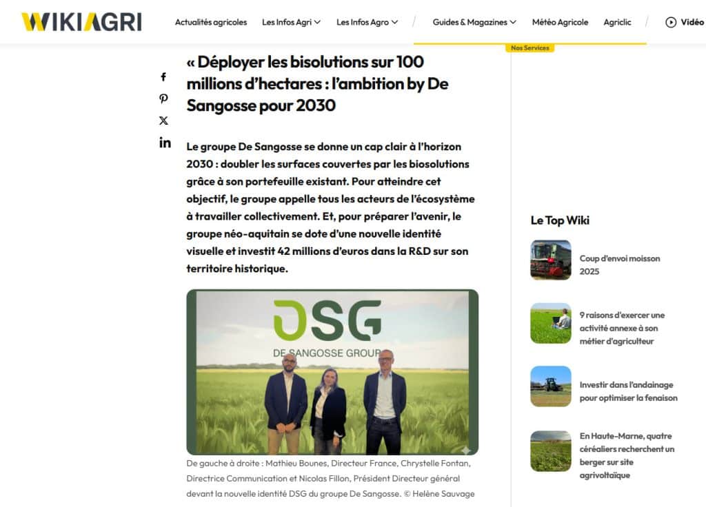 “…Le groupe De Sangosse se donne un cap clair à l’horizon 2030 : doubler les surfaces couvertes par les biosolutions grâce à son portefeuille existant. Pour atteindre cet objectif, le groupe appelle tous les acteurs de l’écosystème à travailler collectivement. Et, pour préparer l’avenir, le groupe néo-aquitain se dote d’une nouvelle identité visuelle et investit 42 millions d’euros dans la R&D sur son territoire historique….”