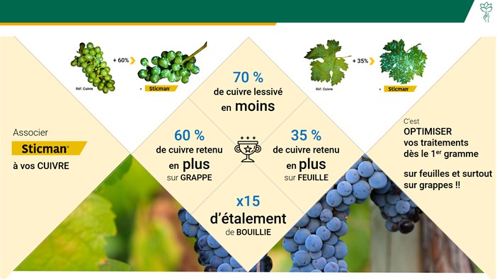 Utilisé sur près de 2 millions d’hectares en France, STICMAN®, est un adjuvant non classé, de référence pour les viticulteurs soucieux d’optimiser l’efficacité de leurs fongicides. Sa formulation unique améliore la protection des feuilles et des grappes contre les maladies telles que le mildiou et l’oïdium.